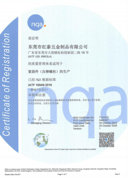 東莞市紅泰五金制品有限公司,公司占地六千多平方米,擁有五十多組螺絲機(jī)及六十臺(tái)自動(dòng)車(chē)床設(shè)備。是一家專(zhuān)業(yè)設(shè)計(jì)、生產(chǎn)ISO、DIN、GB、JIS、ANSI、BS及客戶(hù)指定特殊要求的高精密五金緊固件的制造企業(yè)。